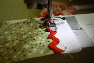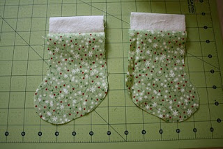 Corte o tecido principal no molde do corpo da meia com o tecido dobrado.Corte os punhos duas vezes.Corte dos pedaços de sianinha de 3,75 cm de comprimento.