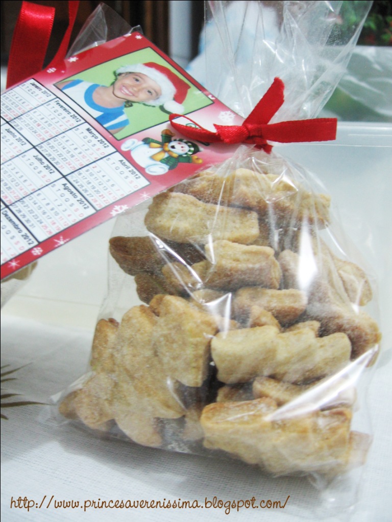 Para presentear amigos e familiares, fiz os famosos biscoitos de gengibre, infelizmente não achei o cortador no formato de homenzinho, mas fiz centenas de árvores e ficaram lindos. Para os familiares fiz os saquinhos com uma foto calendário da Verena: