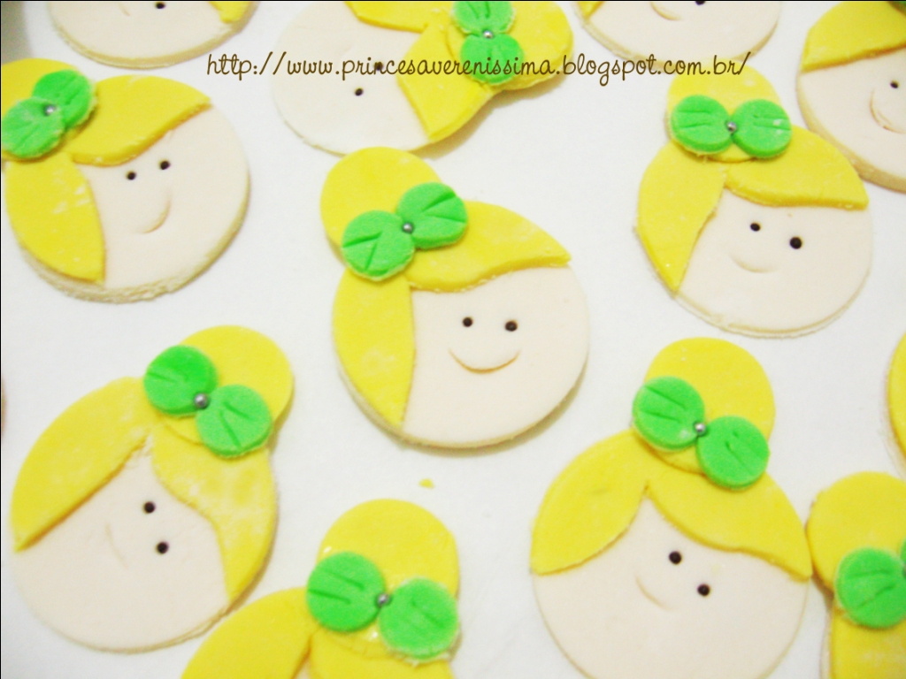 E o feito que mais deixou-me feliz: as carinhas da Sininho em pasta americana (Ô negocinho chato de mexer), errei duas vezes, até descobrir que a culpa foi do corante, estava usando corante líquido, mas não dá certo!!!!!! Tem que ser em gel!!!!! Mas, não desistir!!!