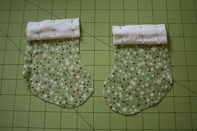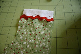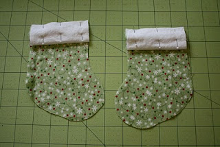 Corte o tecido principal no molde do corpo da meia com o tecido dobrado.Corte os punhos duas vezes.Corte dos pedaços de sianinha de 3,75 cm de comprimento.