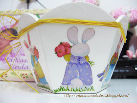 Os vasos foram lixados e pintados com tinta pva branca. Em cada face fiz uma decoupagem de um coelhinho. Já expliquei como fiz aqui. Depois passei verniz e decorei com ráfia e botão cenoura.