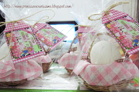 Encomendei cestas de vime pequenas para acomodá-los, forrei-as com tecido xadrez e amarrei fitas nas alças.
