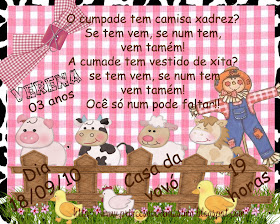ResponderExcluirOlá adorei o convite...a festa da minha filha será com o tema fazendinha....e vou fzer esse convite..só que não axei na cidade ad cestinhas,te mandei um e-mail perguntando também do centro de mesa se vc encomenda,ainda não respondeu...vc pode me dar uma ideia de o que colocar no lugar da cestinha e vc encomenda o centro de mesa?????bjus