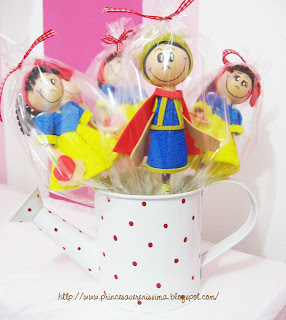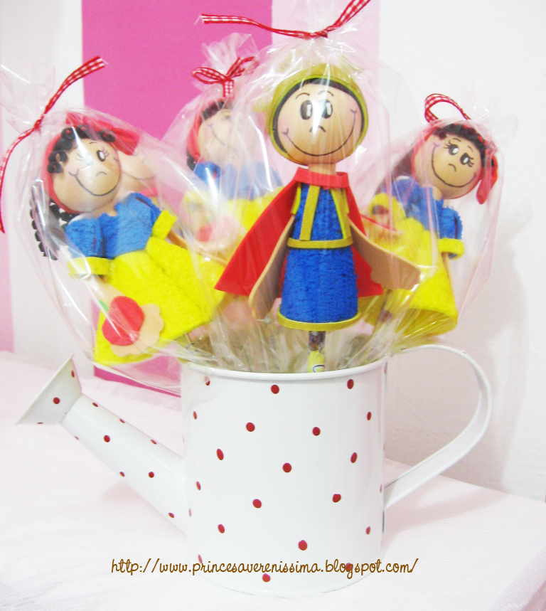 A lembrança: Lápis personalizado com ponteira Branca de Neve para meninas e príncipe para os meninos, as ponteiras foram feitas por uma colega de trabalho muito talentosa: