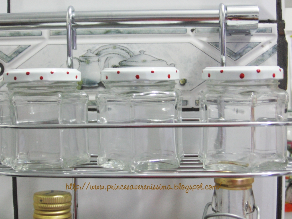 Para que não ficassem com inveja dos cachepots, fiz bolinhas vermelhas na tampa com tinta acrílica brilhante:
